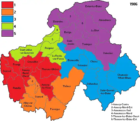 La création de la 6e circonscription peut être vue comme une scission de la 3e avec ajouts provenant d'autres circonscriptions. Cela provoque des changements dans quatre des cinq circonscriptions existantes (la 2e n'est pas modifiée). Les cantons de Frangy et Seyssel passent de la 1re à la 4e , laquelle perd les cantons de Reignier et de La Roche-sur-Foron au profit de la (nouvelle) 3e , qui récupère aussi le canton de Cruseilles de la 1re ainsi que les cantons de Boëge et de Saint-Jeoire de la 5e ; cette nouvelle 3e n'a que le canton de Bonneville en commun avec l'ancienne 3e ; tous les autres cantons de l'ancienne 3e , ainsi que les cantons de Samoëns et de Taninges (en provenance de la 5e ), forment la 6e .