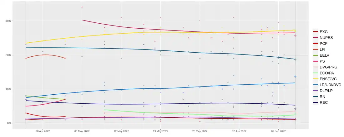 Parallèlement, seulement « 22 % des Français pronostiquent une possible majorité de gauche à l’issue des législatives », ce qui a pour effet de « limiter l’importance de l’enjeu », selon Brice Teinturier, directeur général délégué de l'institut de sondage Ipsos[20], qui a identifié « 127 circonscriptions où le résultat se jouera à un ou deux points près » contre seulement 77 aussi serrées en 2017[21].