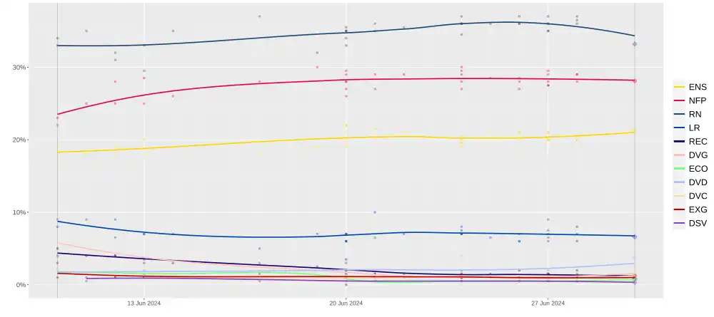 - ↑ 230 à 280 sièges pour le RN, 125 à 165 sièges pour le NFP, 70 à 100 sièges pour Ensemble, 41 à 61 sièges pour LR, les "autres" ayant 22 à 30 sièges