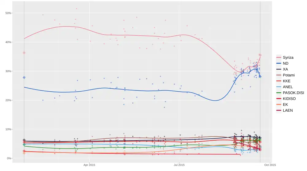 Les élections anticipées sont une victoire nette pour la SYRIZA, au pouvoir depuis . Avec 35,46 % des voix, elle bénéficie d'une avance confortable sur ses concurrents directs de Nouvelle Démocratie. Elle obtient la majorité relative et 145 sièges, ce qui apparaît comme une confirmation des prédécentes élections qui l'avaient portée au gouvernement huit mois auparavant[27]. La SYRIZA bénéficie du rejet des partis traditionnels par les électeurs[28].