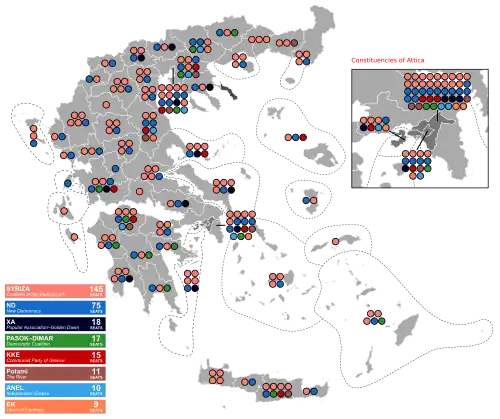 Huit partis atteignent le seuil de 3 % des suffrages exprimés nécessaires pour être représentés au Parlement. La SYRIZA arrive en tête et remporte la prime majoritaire de 50 sièges. Avec 145 sièges sur 300, elle ne détient cependant pas la majorité absolue. Nouvelle Démocratie se classe deuxième et obtient 75 sièges, ce qui en fait le principal parti d'opposition. Aube dorée, l'alliance PASOK - DIMAR, le Parti communiste de Grèce, La Rivière et les Grecs indépendants restent représentés. L'Union des centristes fait sa première entrée au Parlement, tandis qu'Unité populaire échoue avec moins de 3 % des suffrages.