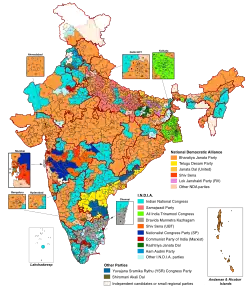 A la surprise générale, la NDA subit un important recul. Si elle conserve la majorité absolue des sièges qu'elle détenait dans la législature sortante, la coalition connait ainsi des résultats bien moins importants que ce que les projections des sondages lui laissaient espérer. Ce recul est particulièrement sévère pour le BJP, qui faisait campagne sous le slogan « Cette fois-ci, plus de 400 » (en hindi Abki Baar 400 Paar), un objectif de sièges qui paraissait pourtant atteignable au vu des sondages d'opinion. Non seulement le BJP ne parvient pas à décrocher avec ses alliés la majorité qualifiée des deux tiers des sièges — soit 370 — qui lui aurait permis de procéder librement à des amendements constitutionnels, mais il perd au contraire la majorité absolue qu'il détenait seul, le contraignant ainsi à dépendre de ses alliés au sein de la NDA[41]. Malgré la victoire, qui fait de lui le deuxième Premier ministre de l'histoire du pays à être reconduit sur trois mandats consécutif après Jawaharlal Nehru, le scrutin est par conséquent perçu comme un revers pour Narendra Modi, qui voit l'opposition renforcée et pourrait se voir contraint de tempérer son nationalisme hindou pour adopter une posture plus conciliante et centriste. Au soir de la publication des résultats préliminaires, le , il qualifie le scrutin de « victoire pour la plus grande démocratie du monde »[42],[43]. Il obtient le lendemain le soutien officiel de ses alliés pour sa reconduction au poste de Premier ministre[44].
