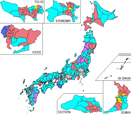 - 2 avec face à eux un candidat tant libéral-démocrate que démocrate : Yoshio Udagawa dans le 16e district de Tōkyō et Kōji Kakizawa (ancien ministre des affaires étrangères en 1994) dans le 15e de Tōkyō,