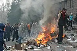 Les manifestants ont scandé des slogans anti-gouvernementaux, pro-occidentaux et pour l'union de la Moldavie et de la Roumanie, tels que "Nous voulons l'Europe", "Nous sommes Roumains" et "À bas le communisme"[5]. Ils ont également remplacé les drapeaux moldaves de la présidence par des drapeaux roumains et européens.