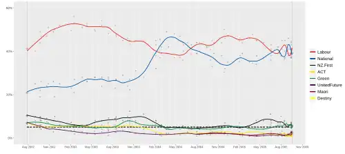Aucun parti ne remporta la majorité, cependant le Parti travailliste de la Première ministre Helen Clark a remporté deux sièges de plus que le Parti national de Don Brash (en) arrivé en seconde position.