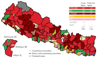 | Parti communiste marxiste-léniniste unifié (CPN (UML)) | 3 173 494 | 33,25 | 41 | 3 082 277 | 30,68 | 80 | 121 | |||||||