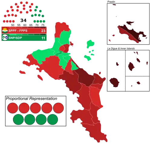 | Parti national des Seychelles-Parti démocratique seychellois (SNP-SDP) | 23 869 | 43,94 | 7 | 4 | 11 | |||||||||