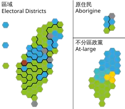 Taïwan est doté d'un parlement unicaméral, le Yuan législatif, composé de 113 sièges pourvus pour quatre ans selon un scrutin parallèle. Sur ce total, 79 sièges sont ainsi pourvus au scrutin majoritaire, dont 73 au scrutin uninominal majoritaire à un tour dans autant de circonscriptions et six sièges au vote unique non transférable dans deux circonscriptions de trois sièges chacune, ces dernières étant réservées aux citoyens aborigènes. Les électeurs votent pour un candidat dans leur circonscription, et les trois candidats arrivés en tête sont déclarés élus. Enfin, les 34 sièges restants sont pourvus au scrutin proportionnel plurinominal avec listes fermées et seuil électoral de 5 % dans une unique circonscription nationale. Après décomptes des voix, les sièges sont répartis entre tous les partis ayant franchi le seuil électoral selon la méthode du plus fort reste, en appliquant le quota de Hare. Un quota de 50 % de députés de l'un ou l'autre sexe est appliqué sur les sièges ainsi élus à la proportionnelle[1],[2].