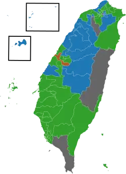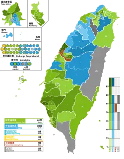 | Kuomintang | 4 723 504 | 33,36 | 13 | 3 | 5 633 749 | 40,57 | 22 | 38 | ||||||