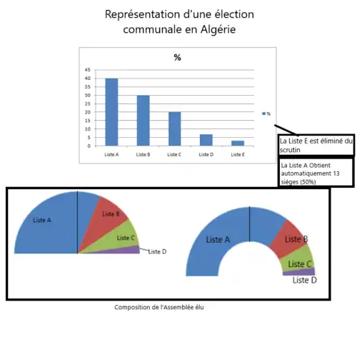 L'Algérie est divisée en 1541 communes dont les conseils municipaux sont pourvus au scrutin proportionnel plurinominal avec un seuil électoral de 5 % et une forte prime majoritaire. La liste ayant obtenu le plus grand nombre de voix obtient automatiquement la moitié des sièges et l'autre moité est partagé entre toutes les listes à la proportionnelle, y compris celle arrivée en tête.