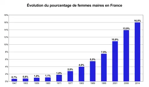 La place des femmes dans les élections municipales françaises demeure, à l'instar de celle qu'elles occupent dans la vie politique française en général, nettement minoritaire. Si d'indéniables progrès ont été réalisés depuis 1947 (date du premier scrutin municipal auquel les femmes sont électrices et éligibles[10]), la marche vers la parité se révèle extrêmement lente. Ainsi, après une longue période de stagnation de 1947 à 1965, la féminisation des conseils municipaux ne commence à s'opérer que timidement à partir du début des années 1970. Il faut attendre les années 2000 pour que des mesures législatives viennent imposer la parité. Toutefois, si la part des femmes dans les conseils municipaux atteint 40,3 % en 2014, seuls 16 % des maires sont des femmes à cette date.