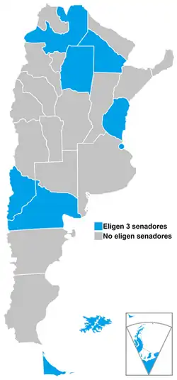 La Chambre des députés (Cámara de Diputados) est dotée de 257 sièges pourvus pour des mandats de quatre ans renouvelés par moitié tous les deux ans. Le système électoral mis en œuvre est celui du scrutin proportionnel plurinominal à la plus forte moyenne, selon la méthode d'Hondt dans 24 circonscriptions électorales plurinominales correspondants aux vingt-trois provinces de l'Argentine plus Buenos Aires. Le nombre de sièges par circonscription varie selon leur population. Un Seuil électoral de 4 % des suffrages exprimés au niveau national est requis pour que les listes de candidats puissent se voir attribuer des sièges[4].