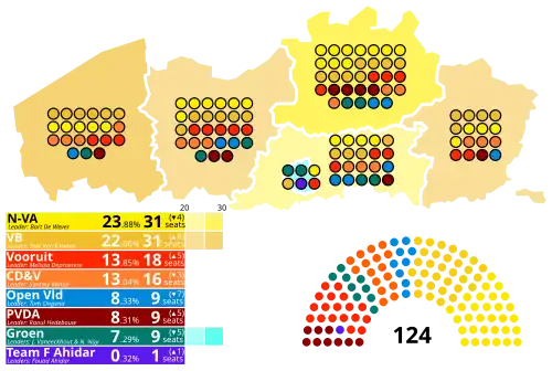 L'élection voit le recul de l'Open Vld, de Groen, du CD&V et de la N-VA, ainsi qu'une progression du Vlaams Belang, de Vooruit et du PVDA. La coalition N-VA - CD&V - Open Vld du gouvernement Jambon n'est pas reconductible (56/124). L'Open Vld et Groen annoncent souhaiter rester dans l'opposition[11],[12]. À moins de considérer une coalition avec le Vlaams Belang et ainsi rompre le cordon sanitaire, la seule majorité possible nécessite une tripartite associant la N-VA, le CD&V et Vooruit (65/124)[13].