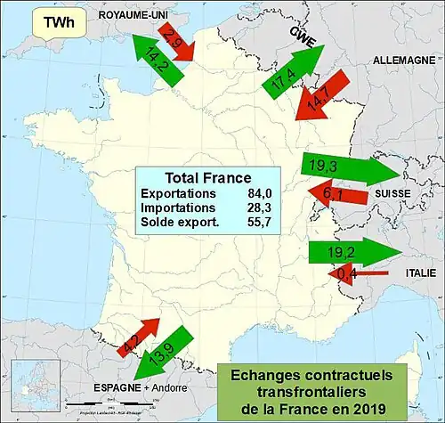 La France est en 2023 le premier pays exportateur d’Europe, par son solde exportateur de 50,3 TWh. En 2019, elle était le premier pays exportateur au monde, effectuant 17,3 % des exportations mondiales. En 2024, son solde exportateur atteint le record de 89 TWh et sa valeur cinq milliards d'euros.
