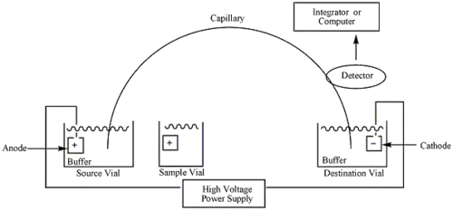 L'appareillage nécessaire pour réaliser des électrophorèses capillaires est relativement simple. Les principaux composants du système sont un flacon d'échantillon, deux flacons source et destination, un capillaire, des électrodes, une source de courant haute tension, un détecteur et un appareil de récupération et de traitement des données.
