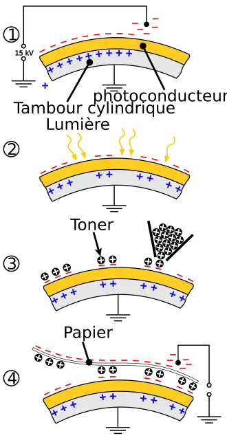 Le tambour photoconducteur est exposé à une lumière laser ou led pour former l'image à imprimer. Les parties exposées à la lumière deviennent conductrices et voient leur charge neutralisée. Les parties non exposées gardent leur charge négative. De l'encre en poudre (toner) (résine colorée) préalablement chargée positivement par triboélectricité est déposée sur le cylindre d'impression. Elle est attirée sur les parties chargées négatives en surface du photoconducteur, c'est-à-dire les zones n'ayant pas été exposées à la lumière (le masque d'exposition à la lumière laser est donc le négatif de l'image que l'on veut imprimer sur papier blanc). L'encre est ensuite transférée directement ou via un blanchet sur le support d'impression, lui-même chargé en électricité statique, le toner est chauffé et pressé afin de se fixer définitivement par fusion et incrustation dans les fibres du papier. Sur certains modèles, le four est enduit d'une fine couche d'huile de silicone. En fin de cycle, le cylindre d'impression est débarrassé des résidus d'encre et rechargé en électricité pour commencer le cycle d'impression suivant.