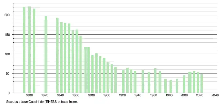 L'évolution du nombre d'habitants est connue à travers les recensements de la population effectués dans la commune depuis 1793. Pour les communes de moins de 10 000 habitants, une enquête de recensement portant sur toute la population est réalisée tous les cinq ans, les populations de référence des années intermédiaires étant quant à elles estimées par interpolation ou extrapolation[18]. Pour la commune, le premier recensement exhaustif entrant dans le cadre du nouveau dispositif a été réalisé en 2007[19].
