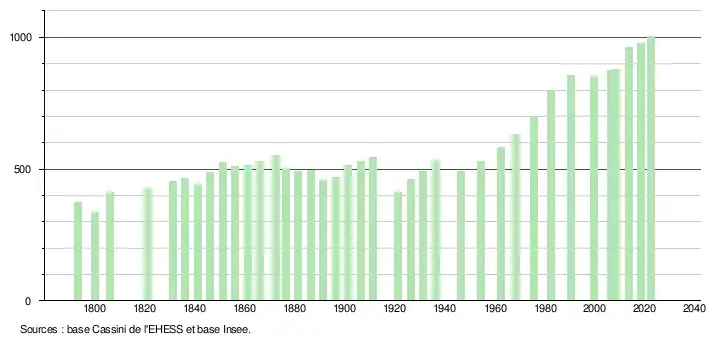 L'évolution du nombre d'habitants est connue à travers les recensements de la population effectués dans la commune depuis 1793. Pour les communes de moins de 10 000 habitants, une enquête de recensement portant sur toute la population est réalisée tous les cinq ans, les populations de référence des années intermédiaires étant quant à elles estimées par interpolation ou extrapolation[22]. Pour la commune, le premier recensement exhaustif entrant dans le cadre du nouveau dispositif a été réalisé en 2008[23].