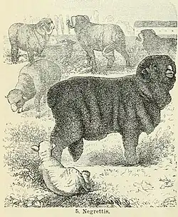 Le Mérinos (espagnol : merina ; anglais : merino) est la race ovine espagnole la plus connue. Elle est intimement liée à l'histoire économique du pays avec le commerce de la laine. Amenée en Espagne lors de la conquête musulmane, le nom de merino ne sera employé en Castille qu'à partir du XVe siècle. La laine est citée sur les documents d'époque comme de la lana merina, mais le nom reste peu usité. Il ne sera vraiment employé que bien plus tard, à partir du XVIIe siècle[51]. Son appellation viendrait du nom d'une tribu berbère, les Mérinides[52]. Longtemps protégée par l'Espagne, la race est exportée à partir du XVIIIe siècle. De nombreux pays réaliseront alors leur propre sélection et acclimatation pour créer leur propre race de Mérinos[12]. Alors qu'au Moyen-Âge, le nom de Mérinos évoque la race de mouton espagnole ; à l'époque contemporaine, ce nom décrit un groupe de races et variétés de moutons descendant du Mérinos espagnol[13].