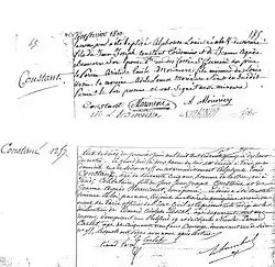« En 1865, Mme Constant obtint devant un tribunal civil un jugement en nullité du mariage qu'elle avait contracté, au titre de ce que l'état religieux d'Alphonse Constant interdisait le mariage (loi organique du Concordat de Germinal an X). De fait l'acte de mariage n'existe plus. »