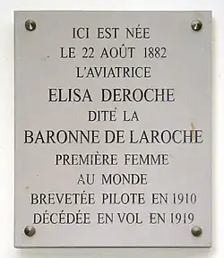 Élisa Deroche[1], connue sous le pseudonyme de baronne Raymonde de Laroche, est une actrice et aviatrice française née le à Paris (4e arr.)[2] et morte le dans un accident d'avion au Crotoy. C'est la première femme au monde à avoir obtenu son brevet de pilote-aviatrice le , faisant date dans l'histoire de l'aviation féminine, avec Thérèse Peltier, Marthe Niel , Hélène Dutrieu et Amelia Earhart.