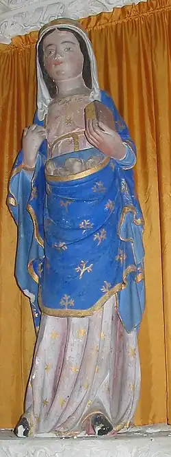 - Dans la chapelle Saint Hubert à Courcelles, une peinture caractéristique la représente avec des pierres dans son tablier.