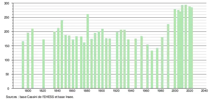 L'évolution du nombre d'habitants est connue à travers les recensements de la population effectués dans la commune depuis 1793. Pour les communes de moins de 10 000 habitants, une enquête de recensement portant sur toute la population est réalisée tous les cinq ans, les populations de référence des années intermédiaires étant quant à elles estimées par interpolation ou extrapolation[17]. Pour la commune, le premier recensement exhaustif entrant dans le cadre du nouveau dispositif a été réalisé en 2004[18].