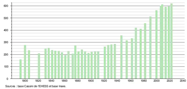 L'évolution du nombre d'habitants est connue à travers les recensements de la population effectués dans la commune depuis 1793. Pour les communes de moins de 10 000 habitants, une enquête de recensement portant sur toute la population est réalisée tous les cinq ans, les populations de référence des années intermédiaires étant quant à elles estimées par interpolation ou extrapolation[25]. Pour la commune, le premier recensement exhaustif entrant dans le cadre du nouveau dispositif a été réalisé en 2008[26].