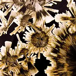 Les cristaux formés sont en général du Zn2SiO2, qui se dépose, atome par atome, autour d'un noyau et se cristallise naturellement, en forme de fleurs ou de flocons de neige, sur les pièces émaillées.