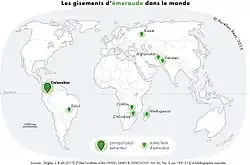 La Colombie est le plus important producteur mondial (60 % de la production mondiale, 6 millions de carats pour l’année 1995) : mines de Chivor, Muzo, Peñas Blancas et de Coscuez appelées le triangle d'or. Non seulement la Colombie est championne de la quantité, mais également de la qualité. Ses émeraudes sont généralement plus pures que celles ayant d’autres provenances. La banque de la République de Colombie possède une collection de magnifiques pierres.