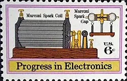 Marconi expérimente des transmissions en télégraphie sans fil dès le début des années 1890. En 1895 il réussit une portée de près de trois kilomètres. Son premier émetteur était constitué d'une bobine d'induction, branchée entre le fil d'une antenne et la terre, et d'un éclateur connecté en parallèle avec la bobine. À chaque fois que la bobine d'induction est excitée, l'antenne se charge temporairement à des dizaines (voire des centaines) de kilovolts jusqu'à ce que l'éclateur produise un arc. Il se comporte comme un interrupteur en reliant l'antenne chargée à la terre et en produisant ainsi une rafale très brève de rayonnement électromagnétique.