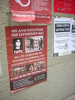 - ↑ En octobre 2010, le policier responsable de cette mort est reconnu coupable d'homicide volontaire et son collègue de complicité : AFP, « Lycéen tué en Grèce: le policier coupable », Figaro, (lire en ligne)