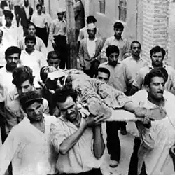 Le matin du 4 juin 1963 éclatèrent des manifestations organisées avec jusqu'à 10 000 participants qui dégénérèrent en attaques violentes contre la police. Les manifestants tentèrent de prendre d'assaut le bâtiment de Radio Téhéran, sans succès. Des dépôts d'armes de l'armée furent attaqués et des postes de police pillés. Les voitures des services de police et de pompiers furent incendiées dans le centre de Téhéran. Parmi les policiers qui avaient essayé d'arrêter les manifestants, ainsi que parmi les manifestants, il y eut des morts[15].