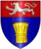 D'azur à la gerbe d'or, au chef de gueules chargé d'un lion léopardé d'argent[1].