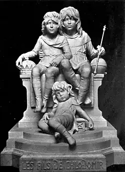 - Châteaubriant, château de Châteaubriant, parc : Les Fils de Chlodomir, 1899, groupe en marbre[7],[8].