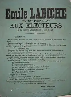 - ↑ L'Opinion nationale, 21 avril 1863, p.2 : « Quant à M. Émile Labiche, il est le véritable représentant de l'opinion libérale ».