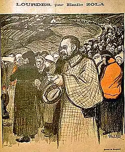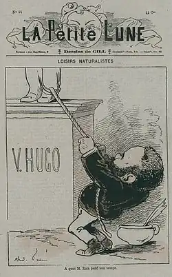 Zola reste soigneusement à l'écart du monde politique, auprès duquel il sait s'engager, mais avec retenue, recul et froideur. L'action politique ne l'intéresse pas et il n'a jamais été candidat à aucune élection. Il se sait avant tout écrivain, tout en exprimant une attitude de réfractaire[29]. Il agit donc en libre-penseur et en moraliste indépendant, ce qui lui apporte une stature de libéral modéré. Il s'oppose radicalement à l'Ordre moral, notamment dans La Conquête de Plassans, interdit de vente dans les gares par la commission de colportage[N 12],[30], et par la publication de La Faute de l'abbé Mouret, une vive critique de la règle de la chasteté pour le clergé, renforcée alors par la mise en œuvre du culte du mariage par l'Église[pas clair][31]. Il défend aussi activement les communards amnistiés par les lois de 1879 et 1880, en évoquant les parias de la Révolution de 1848 dans Le Ventre de Paris et en soutenant notamment Jules Vallès afin que celui-ci puisse publier ses textes[réf. souhaitée]. Ce seront les derniers articles politiques de Zola, puisqu'il a entrepris le cycle des Rougon-Macquart qui va l'occuper pendant vingt-deux années.