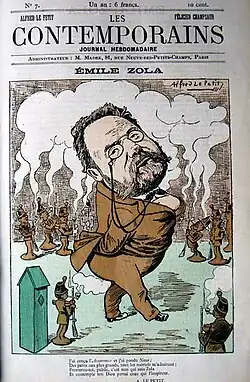 Observateur des hommes et des faits de son temps dans ses romans, Zola n'a cessé de s'engager dans des causes sociales, artistiques ou littéraires qui lui semblent justes, sans jamais faire de politique. Le personnel politique lui semble suspect et, avant l'affaire Dreyfus, il n'aura pas d'amis dans ce monde[N 15]. Républicain convaincu, il s'engage tôt dans un combat contre l'Empire. Les premiers romans du cycle des Rougon-Macquart ont ainsi une visée à la fois satirique et politique[N 16]. Aussi, la censure dont il est l'objet dès 1871 avec La Curée, au retour de la République, le déçoit-elle profondément. Mais il reste fervent républicain, la république étant pour lui « le seul gouvernement juste et possible[36] ».