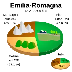 La région comporte trois types de reliefs: la plaine du Pô[2], les Apennins et une zone qui est le transit de l'une vers l'autre dénommée colline (collines).