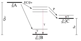 - un mode de décroissance radioactive, qui ne concerne que les nucléides très déficients en neutrons, autrement dit proches de la limite de stabilité proton.