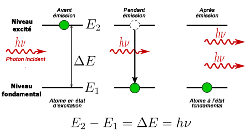 Lorsqu’un électron est excité depuis un niveau d’énergie faible vers un niveau plus élevé, il est rare qu’il y reste indéfiniment. Un électron excité peut se désexciter vers un niveau d’énergie qui n’est pas occupé après une constante de temps particulière caractérisant cette transition. L’intervention ou non d’un paramètre extérieur sur la transition définit s’il s’agit d’une émission spontanée, ou d’une émission stimulée.