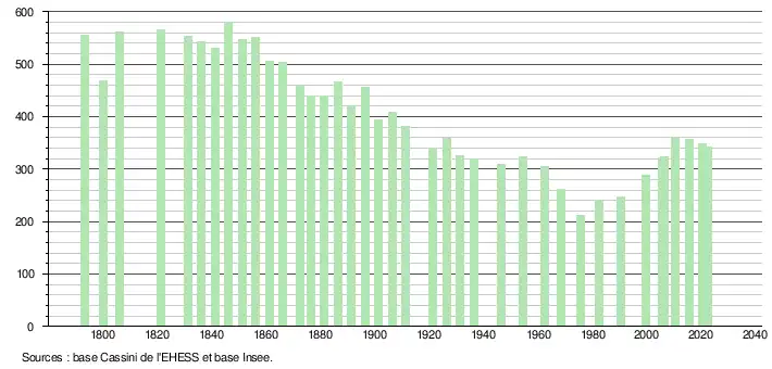 L'évolution du nombre d'habitants est connue à travers les recensements de la population effectués dans la commune depuis 1793. Pour les communes de moins de 10 000 habitants, une enquête de recensement portant sur toute la population est réalisée tous les cinq ans, les populations de référence des années intermédiaires étant quant à elles estimées par interpolation ou extrapolation[47]. Pour la commune, le premier recensement exhaustif entrant dans le cadre du nouveau dispositif a été réalisé en 2005[48].