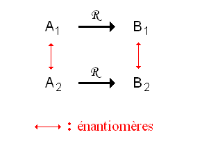 Soient A1 et A2 deux énantiomères. Soit R, une réaction énantiospécifique. Soient B1 et B2 les produits par R, respectivement de A1 et A2. Alors B1 et B2 sont énantiomères.