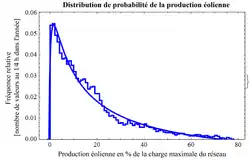 La production éolienne dépendant directement de la force du vent, elle est très fluctuante (on dit aussi intermittente ou volatile) : le graphique ci-contre montre la distribution de probabilité de la production éolienne en Allemagne [en abscisse : production éolienne en % de la charge maximale du réseau ; en ordonnée : fréquence relative (nombre de valeurs au quart d'heure dans l'année)] : on note la concentration des fréquences sur les faibles valeurs de production. RTE publie un graphique similaire dans son rapport sur le Bilan électrique 2012[22].