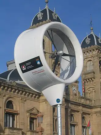 Le premier moulin à vent utilisé pour la production d'énergie électrique est construit en Écosse en par le professeur James Blyth de l'université de Strathclyde, à Glasgow[9]. L'éolienne en forme de voile de Blyth, haute de dix mètres, est installée dans le jardin de son chalet de vacances à Marykirk, dans le Kincardineshire et est utilisée pour charger des accumulateurs mis au point par le Français Camille Alphonse Faure, afin d'alimenter l'éclairage du chalet[9]. L'invention n'est jamais vraiment adoptée car la technologie n'est pas considérée comme économiquement viable, mais Blyth parvient tout de même à construire une éolienne pour fournir de l'énergie en cas de panne à l'asile, l'infirmerie et le dispensaire de Montrose[9].