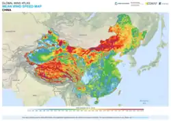 Le potentiel éolien théorique du pays est estimé à 3 000 GW, mais le Chinese Meteorology Research Institute estime le potentiel exploitable à 250 GW à terre et 750 GW en mer. La loi chinoise sur l'énergie renouvelable de a encouragé financièrement le développement de l'éolien. Les régions les plus équipées fin 2008 étaient la région autonome de Mongolie-Intérieure (31 % de la capacité nationale), suivie par les provinces de Liaoning, Hebei et Jilin. Le premier parc en mer, installé fin 2007 sur la plate-forme pétrolière Bohai Suizhong 36-1 de CNOOC, a produit 3,3 GWh la 1re année[2].
