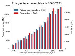 La production d'électricité éolienne de l'Irlande s'élevait en 2023 à 11 605 GWh, soit 37,0 % de la production totale du pays[2].