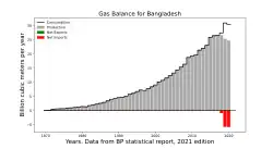Le Bangladesh a produit 901 PJ de gaz naturel en 2021 et en a importé 218 PJ, soit 19 % de sa consommation[2].