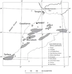 Selon le Conseil mondial de l'énergie, les réserves prouvées de pétrole de schiste au Maroc étaient estimées en 2013 à 53 Gbl (milliards de barils)[5]. Les principaux gisements sont situés à Timahdit dans le Moyen Atlas et Tarfaya dans le sud[6]. Un premier gisement avait été découvert à Tanger dans les années 1930, et les grands gisements de Timahdit et Tarfaya ont été découvertes à la fin des années 1960 ; ils ont été étudiés de façon approfondie ; les réserves suffiraient à couvrir les besoins du Maroc pendant 800 ans. L'ascension des prix pétroliers pendant les années 1980 et 1990 a amené des compagnies européennes et nord-américaines à explorer ces gisements et à expérimenter leur exploitation ; plus de 2 200 tonnes de schistes bitumineux de Timahdit et Tarfaya ont été traités dans des usines pilotes aux États-Unis, en Europe, au Canada et au Japon. Une usine pilote a été construite au Maroc et a traité 2 500 tonnes de schistes bitumineux de Timahdit de 1983 à 1986, et des études ont été menées pour bâtir des usines de 50 000 bl/j (barils par jour) à Timahdit et Tarfaya, mais la chute des prix pétroliers au milieu des années 1980 a stoppé ces projets. L'intérêt pour ces projets est revenu avec la hausse des prix des années 2000 ; l'Office National des Hydrocarbures et des Mines (ONHYM) a conclu en 2009 un accord avec Petrobras et Total pour explorer Timahdit et Tarfaya et un autre avec San Leon Energy Plc pour tester la fracturation hydraulique à Tarfaya[7].