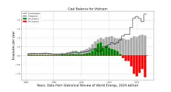 En 2023, la production de charbon du Vietnam était de 48,2 Mt[i 1], équivalant à 1,13 EJ, soit 0,6 % du total mondial ; elle a baissé de 3,4 % en 2023, mais progressé de 18 % entre 2013 et 2023[i 2]. La consommation de charbon s'est élevée à 2,32 EJ, en hausse de 22 % en 2023 et de 222 % de 2013 à 2023 ; la production nationale couvre seulement 49 % de la consommation[i 3]. Le pays importait 0,75 EJ en 2021[1].